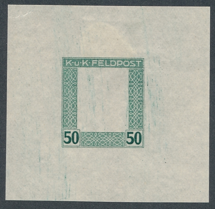 próba matrycowa nieząbkowana niegumowana ramki czysta. Bardzo rzadka próba której wykonano 100 kompletów ramki i podobizny cesarza Karola w barwie definitywnej. Próby opisane w katalogu Fischer oraz Michel Special Austria |
