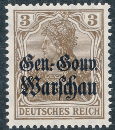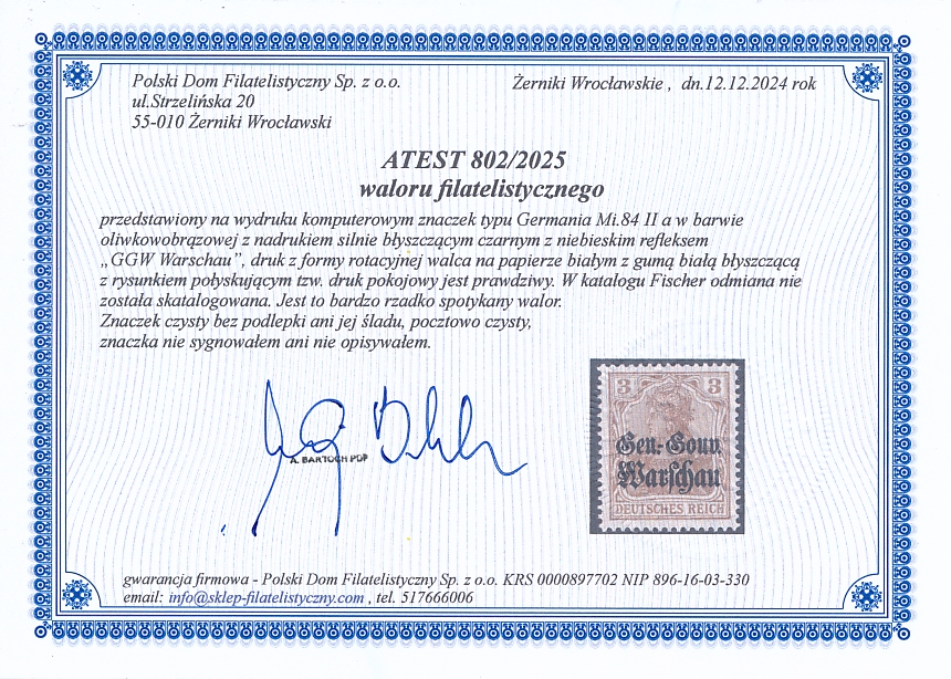 znaczek czysty bez podlepki ani jej śladu typu Germania Mi.84 II a na papierze białym gładkim z gumą białą błyszczącą z rysunkiem połyskującym z nadrukiem silnie błyszczącym czarnym z niebieskim refleksem "GGW Warschau", gwarancja firmowa Andrzej Bartoch PDF - Polski Dom Filatelistyczny. Odmiana niekatalogowana jak również nie opisana w literaturze |