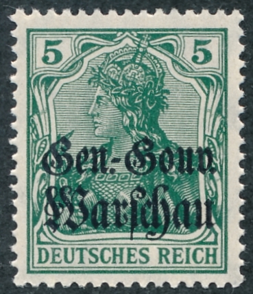 znaczek czysty bez podlepki ani jej śladu w barwie niebieskawozielonej z nadrukiem błyszczącym czarnym z czerwonym refleksem "GGW Warschau" co odpowiada odmianie 8 a wg katalogu Fischer TOM II wyd.2024 i katalogu Michel 8a , gwarancja firmowa Andrzej Bartoch PDF |