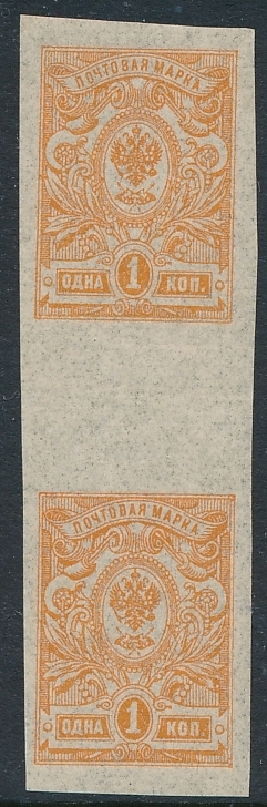 znaczki czyste z oryginalną gumą bez podlepki ani jej śladu wydanie nieząbkowane w parce pionowej rozdzielonej międzypolem, typ II w barwie szarożółtopomarańczowej nakład z 1917 roku z okresu wojennego , bardzo dobry stan zachowania znaczków |