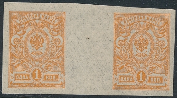 znaczki czyste z oryginalną gumą bez podlepki ani jej śladu wydanie nieząbkowane w parce poziomej rozdzielonej międzypolem, typ II w barwie szarożółtopomarańczowej nakład z 1917 roku z okresu wojennego , bardzo dobry stan zachowania znaczków |