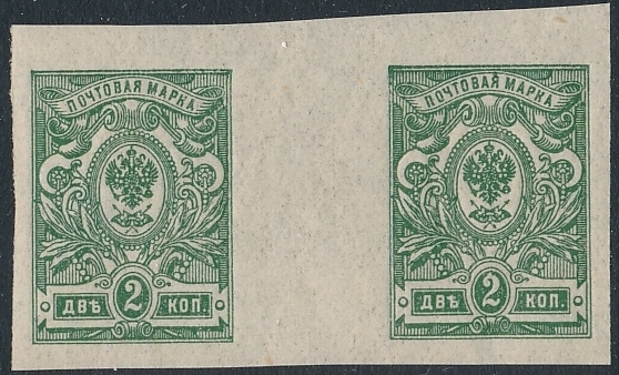 znaczki czyste w parce poziomej rozdzielonej międzypolem z oryginalną gumą bez podlepki ani jej śladu wydanie nieząbkowane, typ II w barwie szarozielonej nakład z 1917 roku z okresu wojennego , bardzo dobry stan zachowania znaczków |